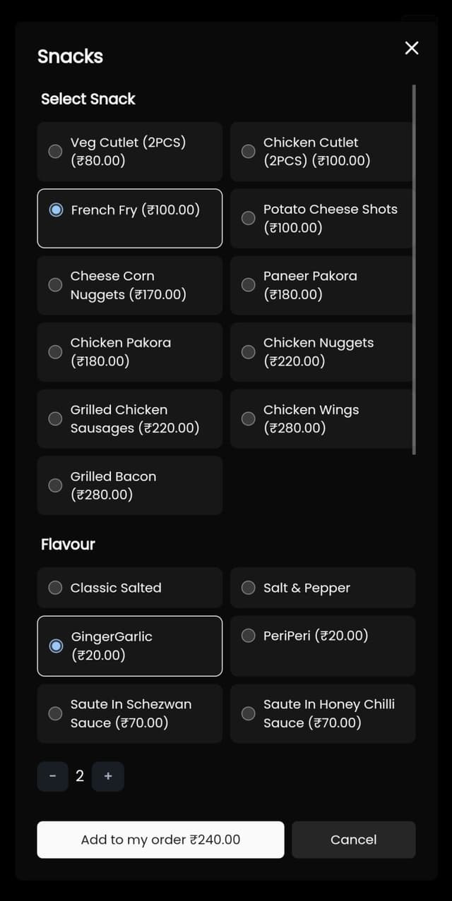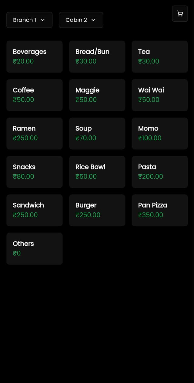 Intuitive menu interface with integrated cart and streamlined checkout flow.